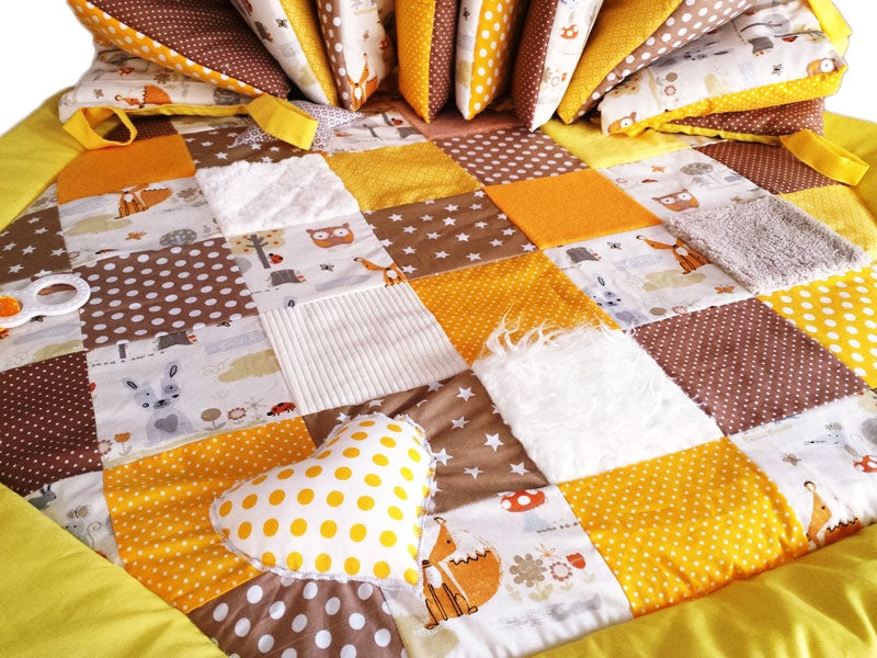 Spielelelemte: gepatcht mit Baumwollstoffen, Fühlfeldern/andere Stoffstrukturen, Rassel, Beißring, Quietscher, Knisterfolie, inkl. Nestchen