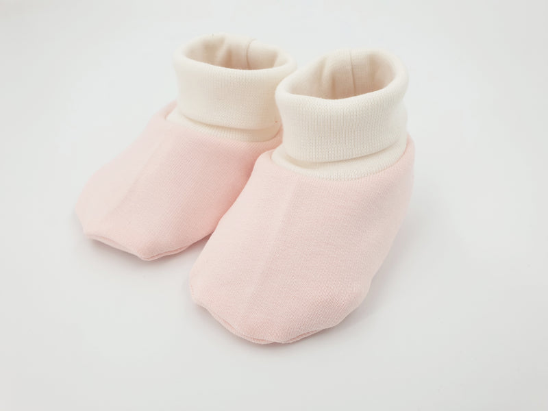 The shoes are made by us from high-quality cotton jersey or cotton waffle jersey. This fabric is 95% cotton and 5% spandex. As a result, the slippers light, cuddly soft and very comfortable to wear on the skin. The inside of the shoes is lined with a soft plush, so the baby doesn't have cold feet. No pressure due to internal seams.